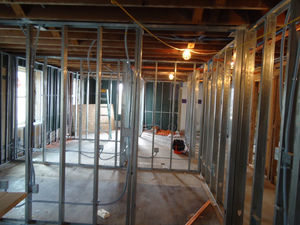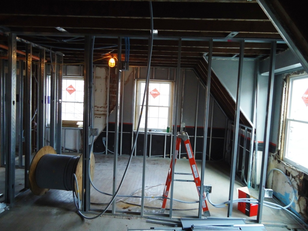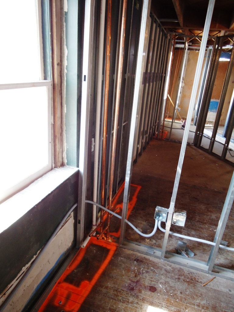 Electrical and mechanical rough-ins started this week. The plan is to convert the existing boiler (installed in 1997) to hot water (currently hot water and steam) and install new air conditioning equipment. Each room will have their own heating and air conditioning units.