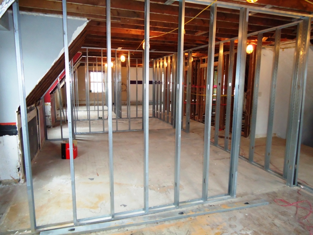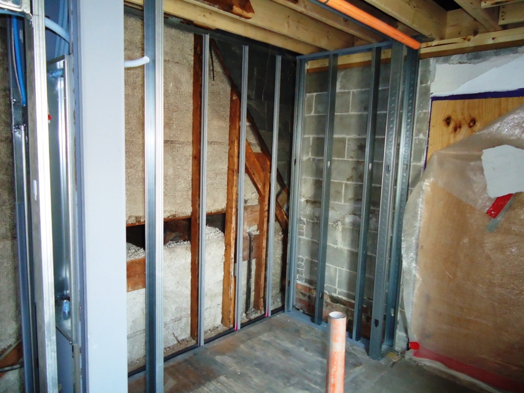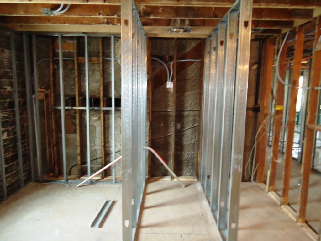 The exterior walls have been furred out to accommodate insulation. This will help with the overall efficiency of the building. There is currently no exterior insulation, other than air space. In addition, this will allow new wiring to be installed.