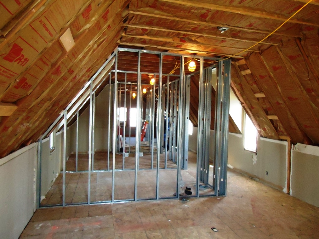 Exterior walls are being furred out to accommodate insulation and provide a tight seal between levels.