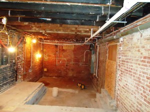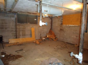 More demo in the basement – what was known as B2 is now gone – the wall between the living area and the beds has been taken down. The far back part of the room will become the new electrical service room. The front part of the room will be a quiet study area and possibly a computer lab. The basement bathroom was cleared and will be replaced with new water-saving fixtures.