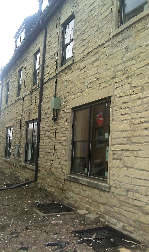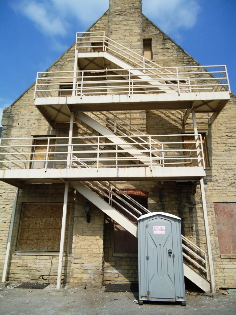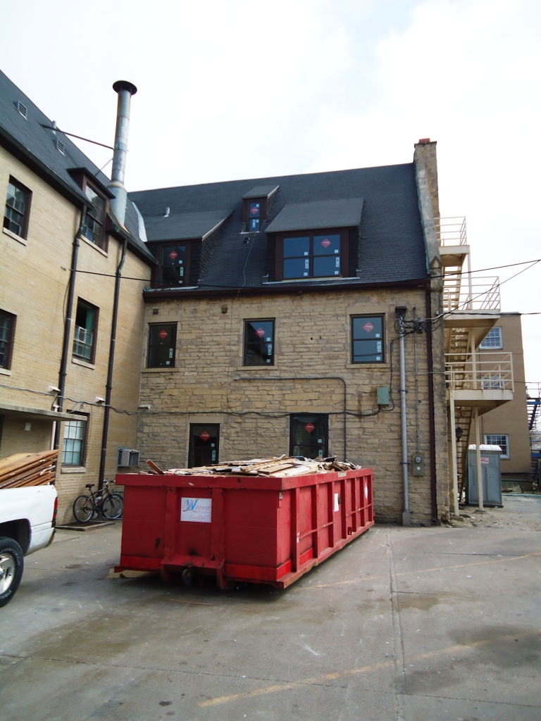 South side of the building (like the bathroom?) — all of these windows will have to be fire-rated. On the left side of the photo — opening have been cut into the walls to accommodate new exit doors.