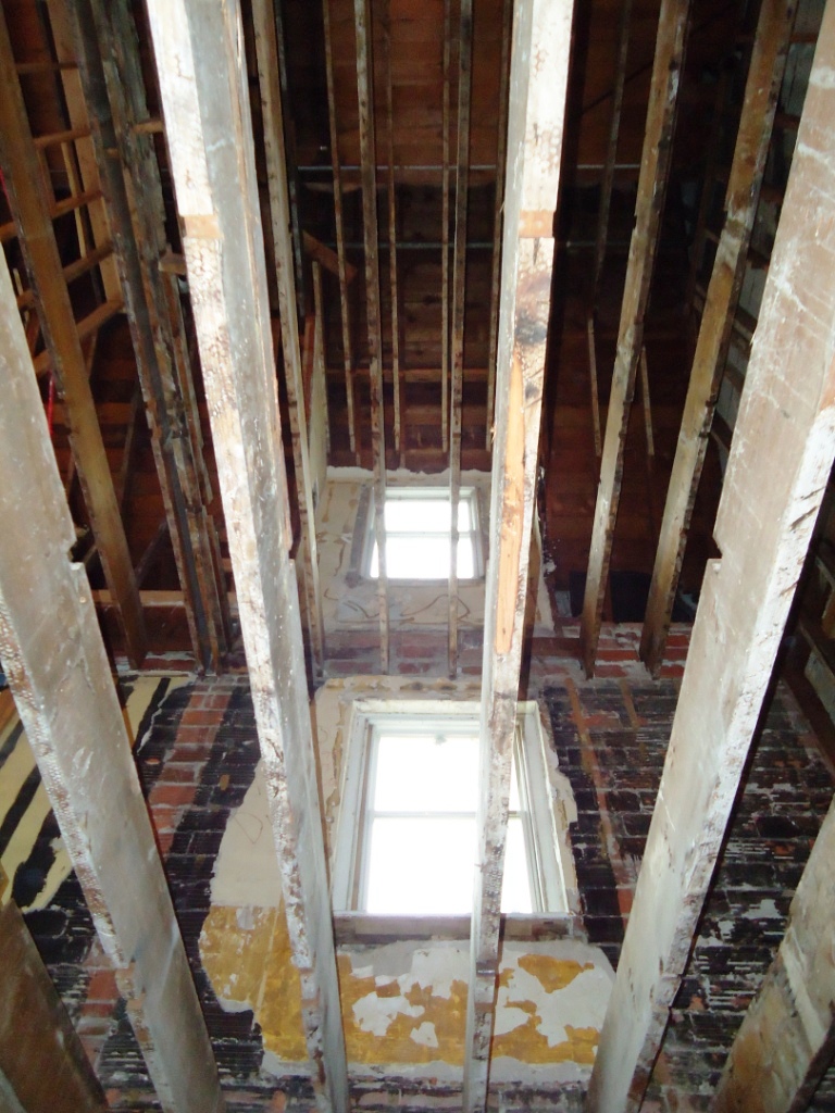 From the housemother's living room -- looking up into 2nd and 3rd old bathroom -- up to the roof.