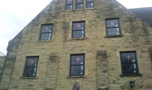 In addition to fire-rated windows, openings were cut into the 2nd, 3rd, and 4th floor to accommodate exit doors. Current fire code requires doors be used instead of the existing windows.