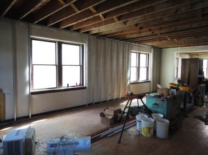 What was Room B2 — standing in the living room — looking to the south (the old electrical panels are on the wall).  A new wall will be put up in the back to serve as the electrical room.  The floor will be leveled where the beds use to be and this will be a new study/computer room.